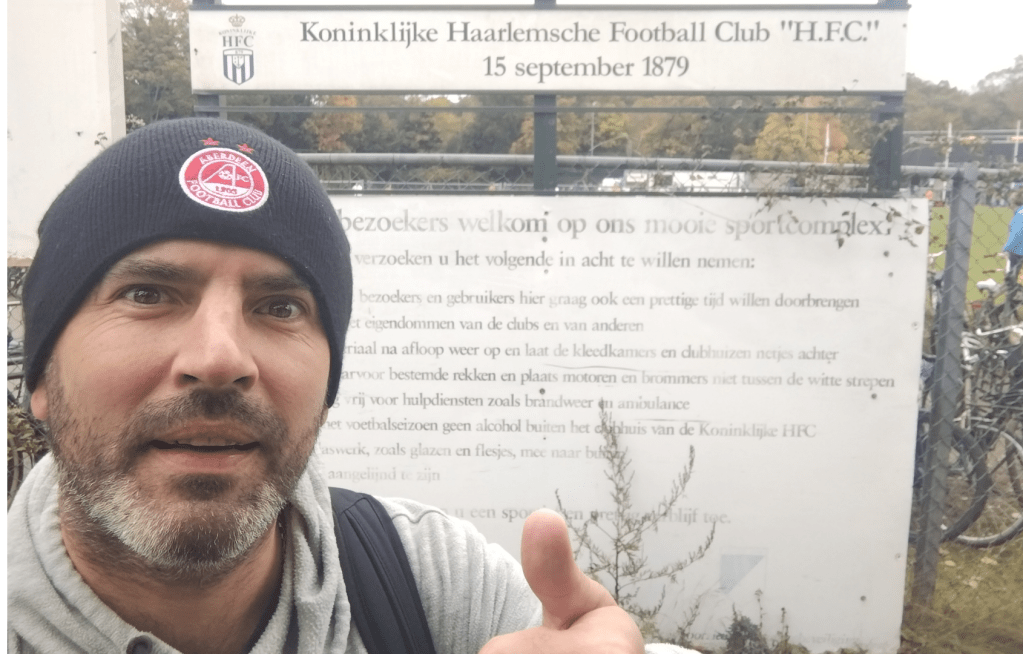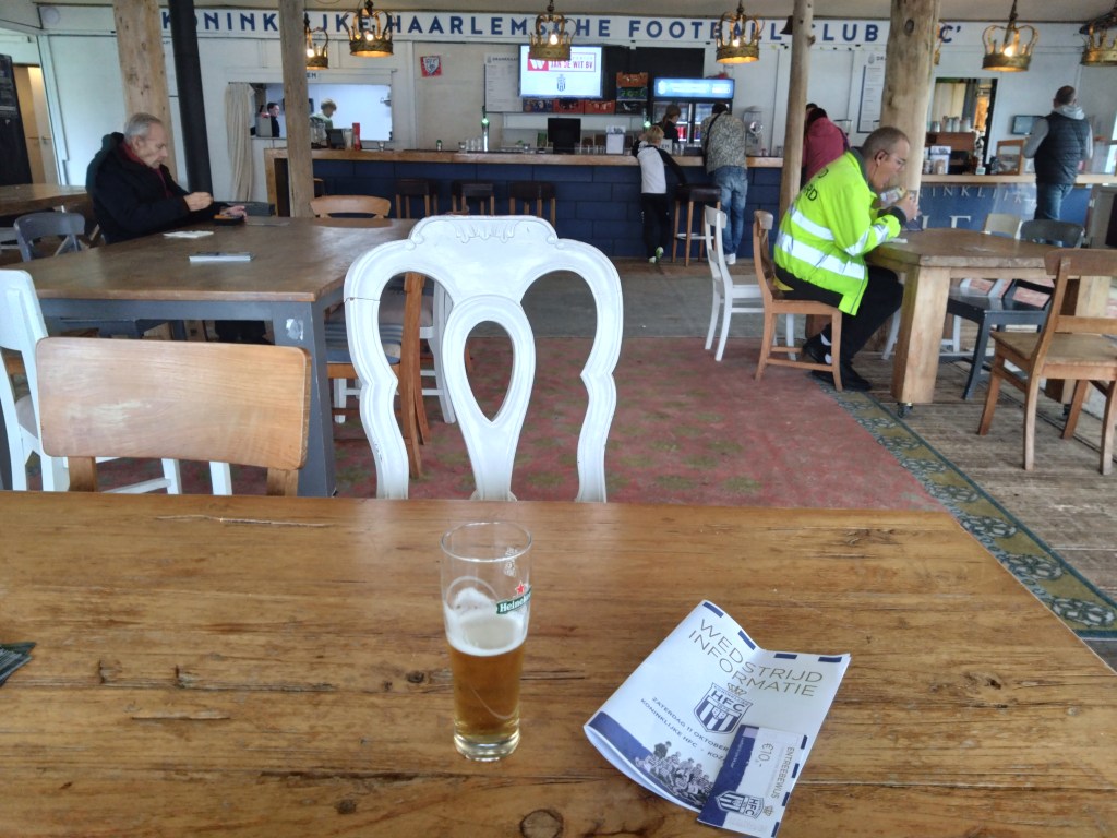 After a swift move through Schiphol I ended up arriving that early in Haarlem(maybe one hour forty before kick off)I had walked in without paying. This after being informed I was beyond the “little ticket house” at the gate by the barmaid in the clubhouse. As I found the “house” I was met by a fantastically nice guy doing the deed. One who was surprised to see an Aberdeen fan and also surprised I had come back to pay him when I would have got away with not doing so. He was a really sound guy and if you are reading, nice to meet you. A good start to the trip . One thing that maybe wasnt so good was the club are currently, like the Heineken Bar back at the airport, renovating. This meaning HFC are not currently playing on their pitch but on one of the back pitches, complete with temporary scaffold for stands. Not a huge issue as it means in future I can come back and see the new clubhouse and stand once complete.