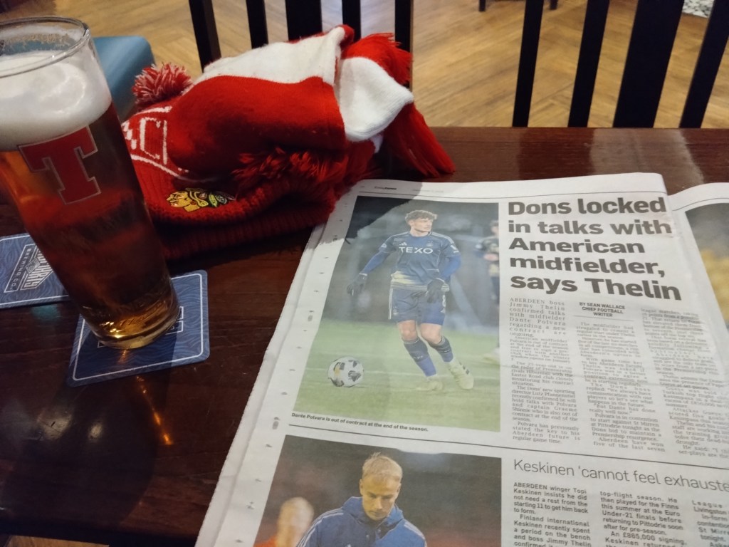 At the start of the day it seemed the Dons were in action in two venues in the city tonight it was a bit of toss up on which game to attend. Poor planning by the fixture mannies saw this top flight fixture clash with the rearranged Aberdeenshire Shield tie up at Spain Park.(Or so I thought) Guaranteed if I was with the Wee Man he would have chosen the south of the city but due to a late appointment for a stress ECG for work purposes (the rules now due to the after effects of covid jabs on peoples health) I was on my tod and truthfully, really there was no toss up. In the end the Aberdeenshire Shield game did not happen tonight anyway,which I didnt find out until later on in the day. A rare foray down Merkland Road East was always to win given the lack of opportunities these days. Also, rare descents on bars I used to frequent nearby is something there is not much scope for these days. To the Butchers Arms with an Evening Express and a pint of Tennent’s was the pre match shenanigans . This stirring up a bit of what used to be in my head as this was the norm for so long in life until other factors came into play. To be noted the inexcusable price of EE these days. Fucking £1.30 the robbing bastards. I bet the inflation on the Tennent’s is nowhere near as severe as whats happened with the now Dundee rag from days of old when the Butchers was a frequent pre-Pittodrie stop off. There was definitely a nostalgic vibe to the early part of the night which was enjoyable. As I was leaving Andy Walker was on the telly at Pittodrie on Sky Sports news, I couldn’t hear him as the other TV’s noise was up. One thing I could guarantee that hasn’t changed over the years is his dislike for the Dons. It was probably better that the fantastic slap bass from Paul Simon’s ‘You Can Call Me Al’ was the soundtrack to the pub as I exited. From memory lane to Hutcheon Street I headed.