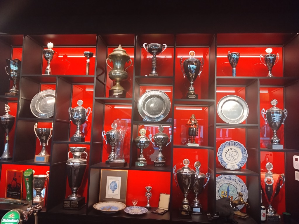 Six minutes from Schiphol to Amsterdam Zuid is all it took on the loco for this latest adventure. It’s not even worth adding in the four minute walk from the station to the ground. I will point out though this is clearly a well to do area, it looks like the ABN AMRO headquarters are there for example, it is not short of money and that is clear . I was not heading for scheme fitba thats for sure. Without thinking, I was was following the canal which was lit up by the numerous floodlights from the ‘lesser’ parks (four I think)but there was no mistake finding the Goed Genoeg, the canal, the stand, the seriously dapper security(night club like). Ten Euros and a programme in hand I was in the ground just as AFC came out to warm up, a quick look about inclusive of a squint at the awesome architecture at the far end of the park came before sampling the amber delights in the bar . On the architecture it’s a magnificent view and thats from a non architectural brain. Think one massive block of flats that have been hit with a Hellfire rocket and you are getting somewhere. It really is quite the wonderful sight and something totally different. With plenty time to spare it was to the clubs juicer. A huge place and tidy to boot. Old photos, memorabilia and a trophy cabinet were right up my street, as were the €3.20 Heineken’s. A busy place saw a youth team serenaded with a full bar of punters singing a bit of Queen and ‘We Are The Champion’s’ after a title win I assume. A couple of jars burnt some time prior to kick off as the bar filled up significantly. A good cash cow for the club which is what we would call a community club with various teams across numerous age groups.