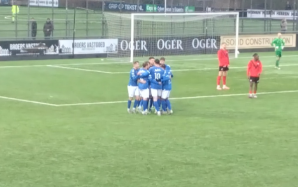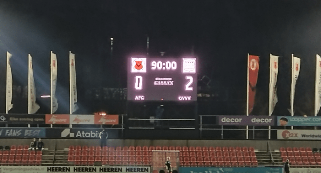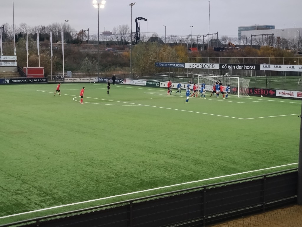 The game started well. Full of energy from both teams on the attack. The visitors had the biggest chance in the early stages calling AFC keeper van Zetten into some impressive action. Saving a long drive at full stretch the rebound fell to GVVV captain Barry Maguire(not a very Dutch name) who thought he was in luck but the speed at which van Zetten moved to save the secondary shot was highly impressive. Delano Gouda was to have a pot shot from the edge of the box for the home side soon after but it was saved well by van Kouwen . Watching the game unfold I was impressed with the standard. Two teams looking to play good football and two teams looking to have a go. It was a decent watch. Going back to Maguire, the 36 six year old veteran ex Utrecht,VVV, Sarpsborg and Limerick man has clearly played the game at a decent level. His football brain is there to be seen. Always in the right place, always looking for the ball and always looking to start attacks from his centre half berth. As the game grew the men from Veenendal were putting their footprint on proceedings and they took the lead mid half in truly fantastic style. With the award of a free kick 20 yards out, Arwin van Soest shaped up as if to fire a effort on goal.This made the wall jump at which point van Soest sent the ball under the wall and into the bottom corner. Brilliant trickery and despite being a worm burner of an effort, the placement and surprise element gave van Zetten no chance. Easily the best goal I have seen this season in the flesh. Surprised me as much it did the AFC team. Keeping on the keeper Gijs van Zetten, I think he was lucky not to see red moments later as it looked awfully like he handled outside the box when racing out to deal with a through ball. I may have seen the best goal of the season potentially but I have definitely seen the daftest thing I will see in a game. From the adjacent lesser pitch a ball flew onto the pitch (which is some going by the way). GVVV man van Soest was closest to the rogue ball. He struck it low to remove it from the park but in brilliant comedy timing AFC’s Guss van Weerdenburg received the actual match ball at left back and burst to a sprint out from the defence only to see himself tackled by the ball van Soest had try to dispose of. The accuracy was not deliberate but it was bloody hilarious with the timing being so perfect as was van Weerdenburg’s stunned reaction. I would love to see it again. The half was seen out by a decent chance a piece when firstly Milan Eliasar struck an effort just the wrong side of the bar from distance for the home side. This was followed by a tame header from GVVV man Willems who ought to have buried his effort.