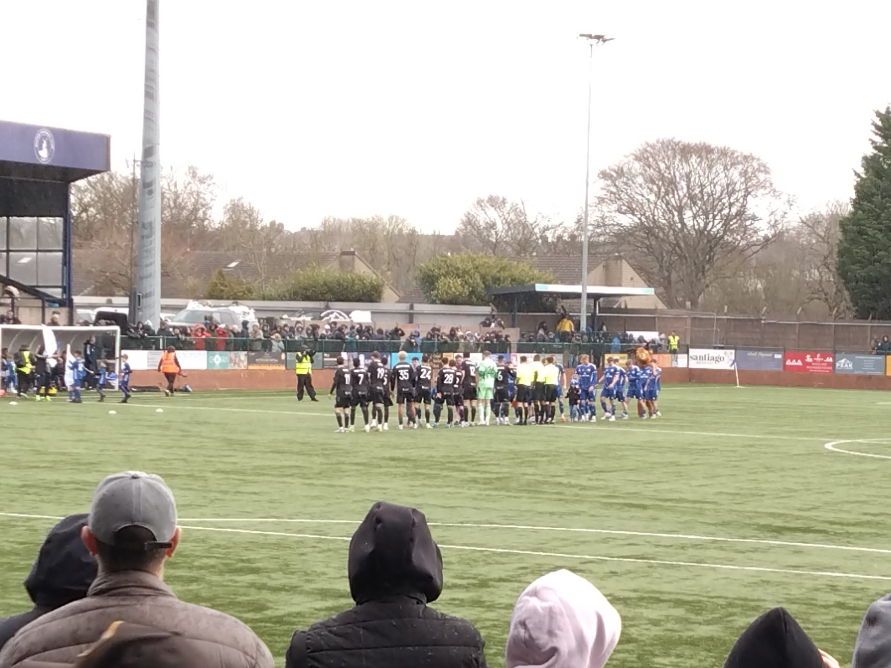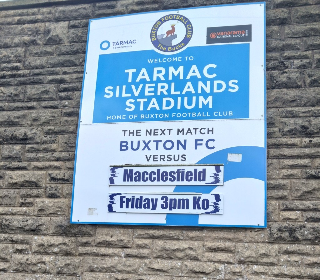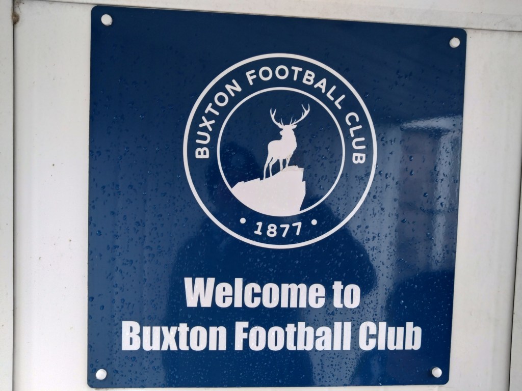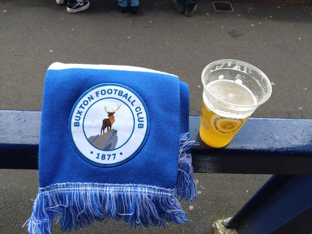 After 6 1/2 hours on the road, many of which in torrential rain and 106 tunes on the Ipod we arrived in Derbyshire at an elevation 1034 feet above sea level, this would explain why our venue for the afternoon is the highest ground in the UK. The afternoon started off with a wander about the town and I was immediately taken with it. Of course you have the vape shop and Betfred but you have a load of cozy local businesses including an old school tobacconist/toy shop and days gone by sweetie shop. But the town seems to be full of pubs and eateries too. We settled on The Railway for lunch and the customary pints and J2Os. A tidy juicer which was full of fitba types heading to Silverlands. Nice folk behind the bar as was the mannie we spoke to outside. From here Wee Man wanted to watch warm ups so up Holker Road we headed. By up I mean up as the trajectory of the street felt like the travelator from Gladiators with a belly full of ale. So early we arrived at the ground the Macc players were not even out for the warm ups yet as The Buxton men were in the early stages if theirs. As we looked about Wee Man was gifted an Easter egg by a Buxton player which was immediately and inevitably devoured as I scoofed a pint in the terrace as we sheltered from the rain which had gradually got heavier over time. Despite there being 45 minutes to kick off the crowd was building to impressive levels. The away end which took up the whole far side wing was filling up with the short distance travellers from the west. As we were in the home end I chatted with a few of the locals and they were really friendly despite a couple of clear “what the fuck is that accent” type looks I was given. Just as the pub showed earlier the Buxtonians (is that what they are called?) are a sound bunch and very welcoming. I was enjoying this away day choice and armed with my new Buxton tourie I was a fully fledged Buck for the day. The game was action packed. An early goal set the tone when Buxton man Cian Coleman bent a brilliant effort across goal into the right hand side of the goal. It was one of those efforts you knew was goal bound as soon as it left his foot. Six minutes gone and we had a goal. Rare earliness compared to recent matches viewed on this current time hime from my work. But the lead was short lived as tricky Macc man Isaac Buckley-Rickets was upended in the box. A clear penalty despite the half arsed protestations from.the home side. Captain Paul Dawson stepped up and made no mistake from 12 yards this in the 13th minute. With a rare break in the weather we headed for a pie and let me tell you it was a delight. I once waxed lyrical about Wick Academy having carrot in their steak pies and how it just worked, Buxton do the carrot too. The gargantuan girthed pie was beautiful to taste but fell to bits unfortunately, (maybe why you are given a polystyrene tray) leaving me to rip my coffee cup up to act as a makeshift spoon. But as far as fine tasting pies this was up there. Back on the pitch Macclesfield were right back in this and took the lead via their captain Dawson who struck what looked a worm burner from the edge of the box, it looked tame and I could be wrong but Buxton keeper Young looked to get a hand to it but it was weak? It looked it from our vantage point. One thing that could not be doubted was the questionable defending that lead to it. A high ball was completely misjudged by Davidson letting Macclesfield in behind. On the Macclesfield captain how he did not walk for an elbow was criminal refereeing. As he went up for a challenge soon after his second goal , his arms were at his side then he lifted his arm pointing his elbow into the Buxton mans face. This was not arms up for leverage, it was arm up for malice. Incredibly the referee pulled him up and booked him. I would love to hear the reasoning behind it. How can such an action be deemed a yellow? But even on a booking the man was constantly chirping in the refs ear. I would have binned him but this ref just gave him chance after chance, while booking others for the same. His opposite number Burton for Buxton was then pulled up for a foul throw. A rarity to see but this was a seriously poor effort much to our amusement. The poor refereeing was not over for the half and Macclesfield were once again lucky not to lose a man when a clear pull back on a Bucks man who I reckon would have been clean through was totally ignored. By pull back I mean headlock. Truly terrible officiating