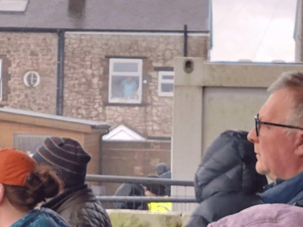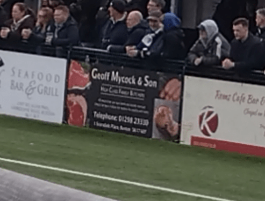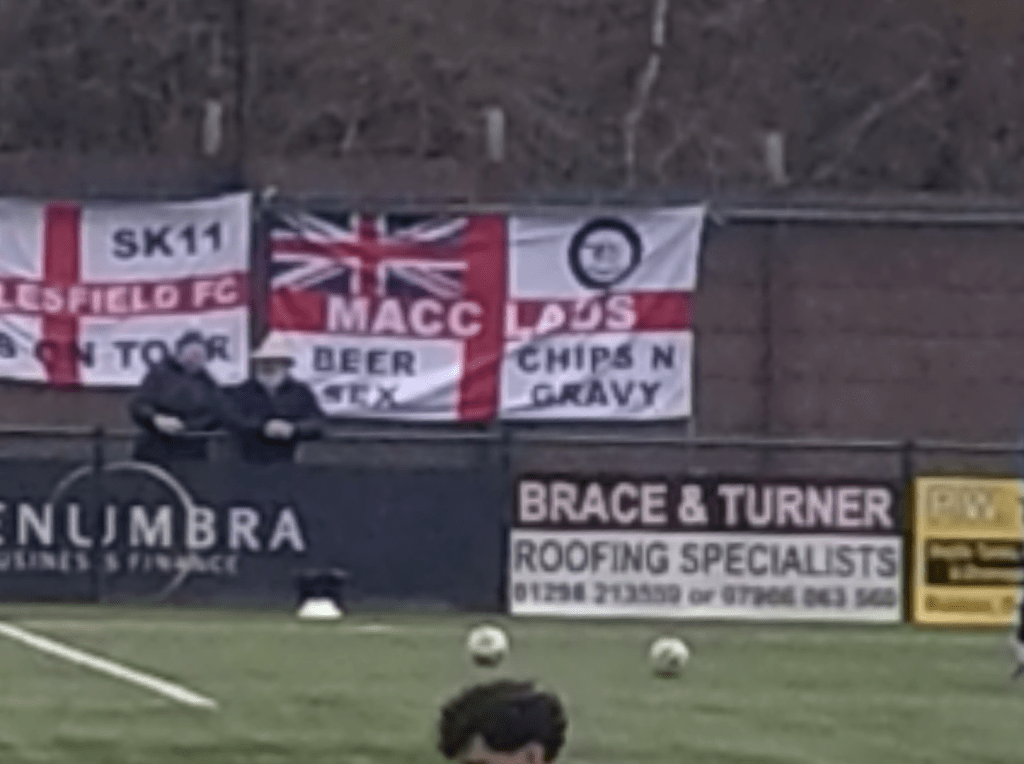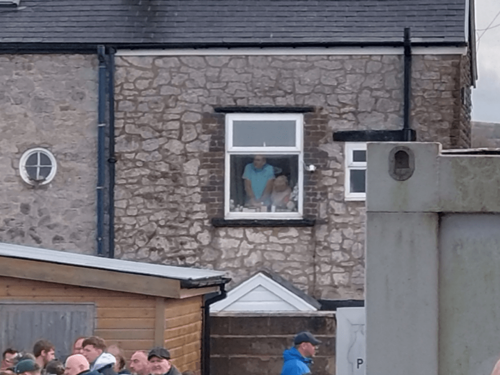 Back in the bar saw more chat with the affable locals as I queued for a pint. I was genuinely loving how the day was panning out. There is a lot more to a day at the fitba than the action in the pitch and I was definitely becoming very fond of Buxton as a place in general.I do try to live by “treat others as you would like to be treated” and there is definitely a vibe of that in the Peak District. The second half saw a much better Bucks. They seemed more forceful with their attacks and they paid off ten minutes into the half when a cross from the left found George Ward with his back to goal in the middle of the box and with one touch spun losing all the defenders and finishing past Ravenhill who had no chance. Quality stuff. Wee Man and I were both in agreement that Buxton were looking good here and a win could be on the cards. Even the mannie who was watching from his window in an adjacent house got his missus to watch once the equaliser was in. Then against the run of play we were treated to a potential goal of the season contender. Step forward Elliot Osbourne who at the edge of the box took a defensive header down on his chest and followed up by unleashing a volley into the top corner. Although I was wanting a home win I couldnt help but be impressed with this fantastic strike. The goal knocked the stuffing out of the Bucks and five minutes later the away side grabbed another via Luke Duffy. Game over. The day had been brilliant so far, but it soured somewhat as the fourth goal opened the gate to the mutant zoo to our right and as bottle came across the segregation fence hitting me off the chest and up into my face. Plastic it may have been but with it being full with the lid on it rattled my jaw. This leaving Wee Man to shite himself and with good reason as it just missed him(hes 11 for the record). This as all the identikit floppy fringed alpaca wannabe Macc hard men clad in Stone Island and Lyle and Scott thought they were hard as fuck. I counted eight kids in my vicinity and these wee fannies across the fence thought they were tough guys as they continued to lob shit inclusive of vapes and snuss tins over the fence. (I hope Baggy Anne gets a hold of you lot). A local behind us checked if everything was ok (again Buxtonians are sound) and explained there is never trouble at Silverlands and Macclesfield have a chip on their shoulder about going bust and dying and are not even a historic rival(Matlock Town are for the record). We shifted away to the far side for the remainder but the goose was cooked for the Bucks unfortunately.